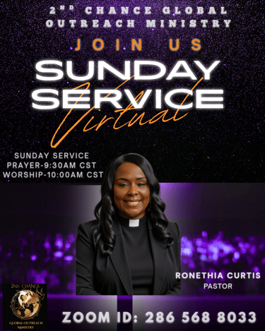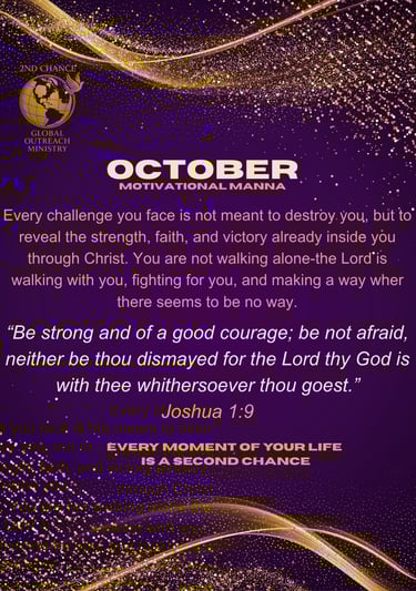 2nd Chance Global Outreach Ministry is not just a ministry - it is a divine assignment. We are a global ministry called to restore the broken, revive the weary, and realign the lost with God's original purpose. Through the power of the Holy Spirit, we are raising up Kingdom ambassadors who will impact nations, shift atmospheres, and bring transformation to lives across the world. We declare that this is a ministry of restoration where chains are broken, destinies are unlocked, and God's grace gives new beginnings. Our reach knows no boundaries - from the local community to the nations - because our mandate is global. Isaiah 61:1 "The Spirit of the Lord God is upon us, because the Lord has anointed us to preach good tidings to the meek; He has sent us to bind us the brokenhearted, to proclaim liberty to the captives, and the opening of the prison to those who are bound."